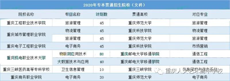 从已公布招生数据的学校来看,今年专本贯通招生院校增加至22所,相比去年新增3所院校,分别是:重庆青年职业技术学院、重庆机电职业技术大学、重庆工贸职业技术学院。2020年计划招生3285人,其中文科招生340人,理科招生2945人,总计划相比去年增加370人。